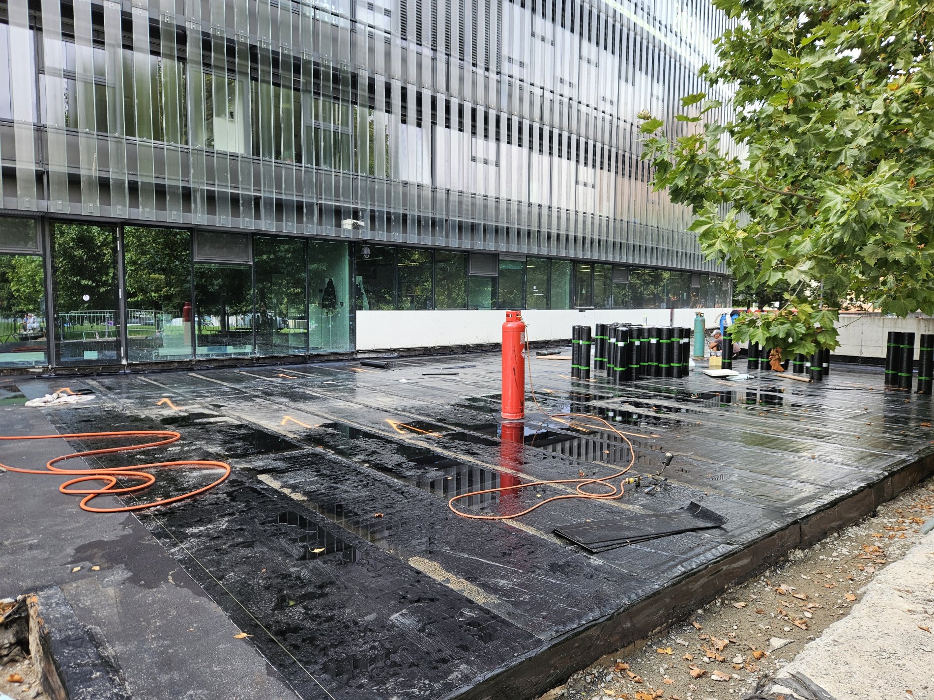 Původní hydroizolace byla nefunkční, především v oblasti ukončení u fasády a v detailu přechodu z vodorovné stropní desky na svislou konstrukci, kde docházelo k zatékání.