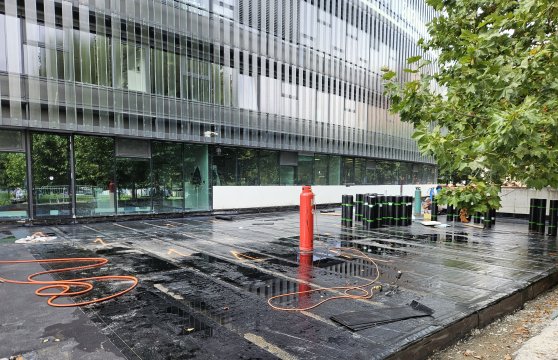 Následně byly položeny spádové klíny z pěnoskla, vyrobené podle přesného kladecího plánu v potřebném sklonu. Na spádovou vrstvu byla posléze provedena silikátová nosná deska s armaturami při spodním líci. Technologická přestávka pro zrání této vrstvy skončila v srpnu a nyní po vysprávce smršťovacích trhlin byla zahájena pokládka hydroizolační vrstvy PMMA detaily okrajů.