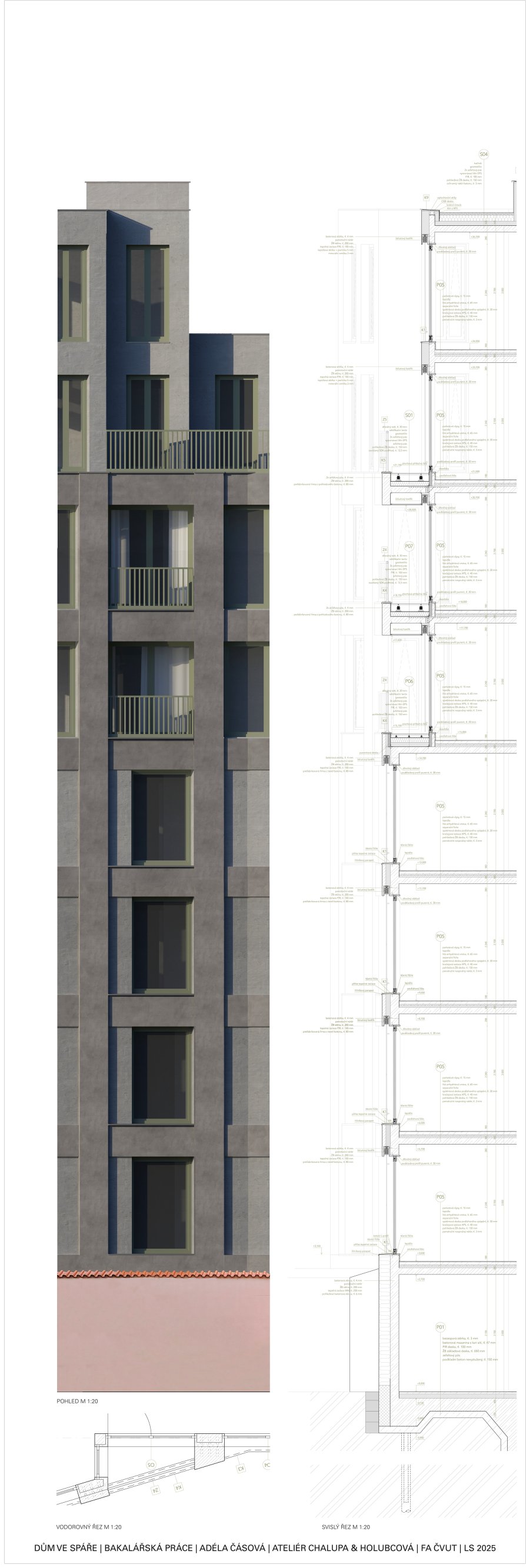 Bakalářská práce se zabývá návrhem bytového domu s komunitním centrem umístěného v proluce historického centra města – „ve spáře“. Cílem práce bylo rozpracovat architektonickou studii se zaměřením na stavebně-technické, konstrukční a technologické řešení objektu. Součástí návrhu je také požárně-bezpečnostní řešení, zásady organizace výstavby a realizační projekt vybraných částí interiéru.