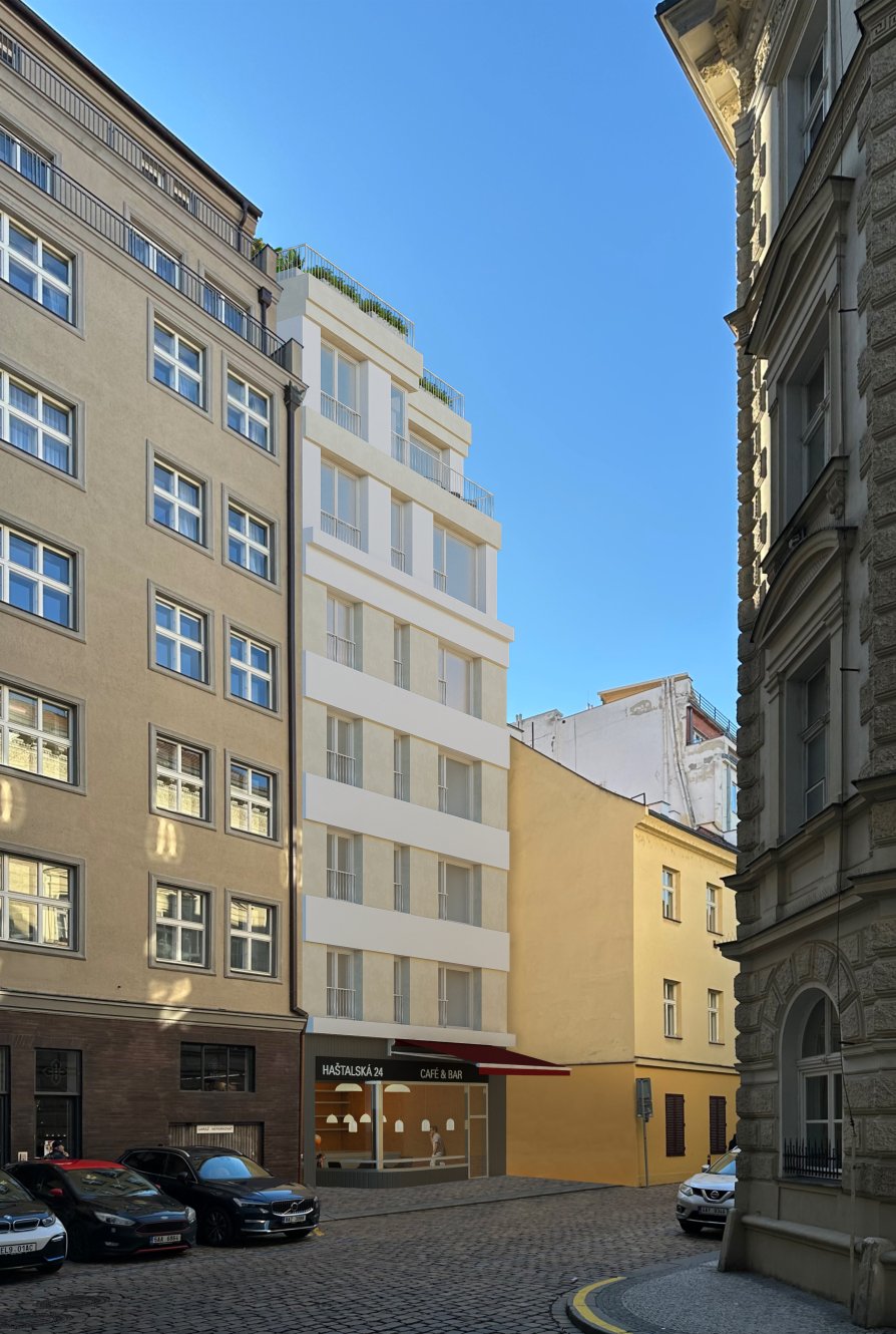 Projekt bytového domu doplňuje proluku v Haštalské ulici a reaguje na řadu urbanistických a prostorových výzev. Z jedné strany je objekt lemován výrazným prvorepublikovým palácem Dlouhá, z druhé nižším palácem U Zeleného stromu. Nepravidelný půdorys, dochovaný objekt bývalých stájí a průjezd na pozemku zásadně ovlivnily architektonické řešení. V přízemí se nachází kavárna pokračující i do suterénu a vstupní prostor se schodištěm a výtahem. V dalších podlažích jsou navrženy bytové jednotky různých velikostí a dispozic, přičemž nejvyšší podlaží tvoří loft s prostornou terasou. Všechny byty mají francouzská okna, která zajišťují dostatek světla a umožňují výhledy například na Hradčany nebo Týnský chrám.