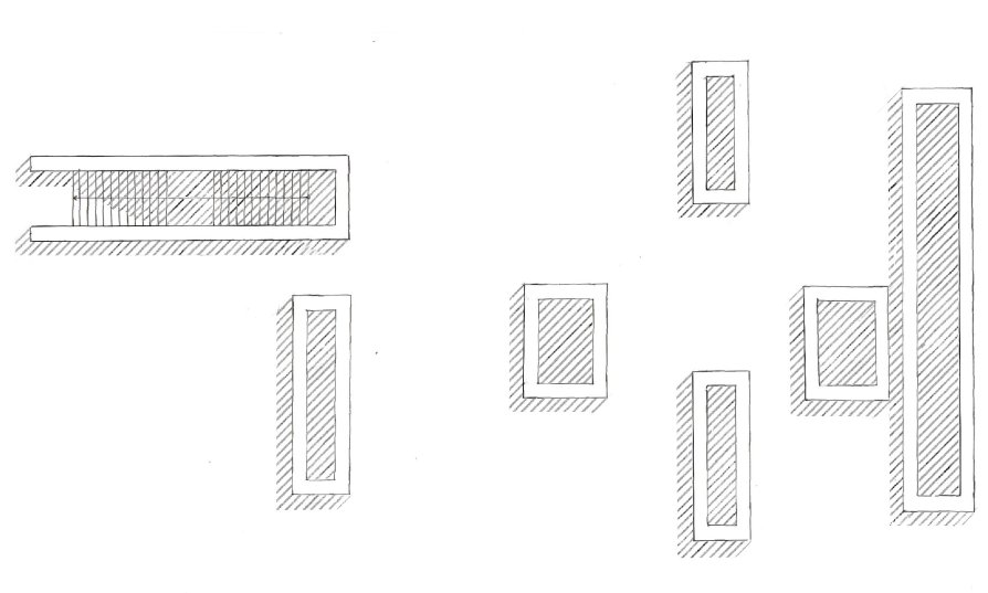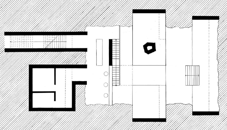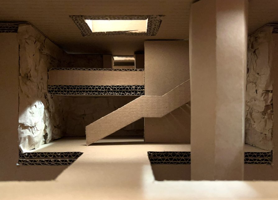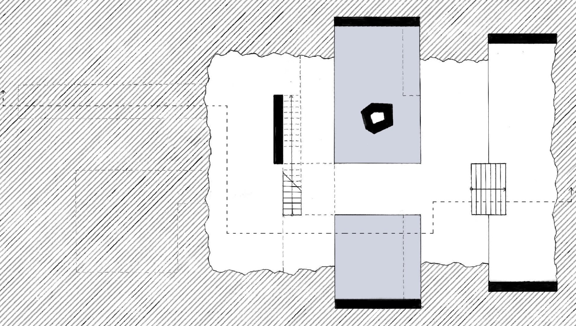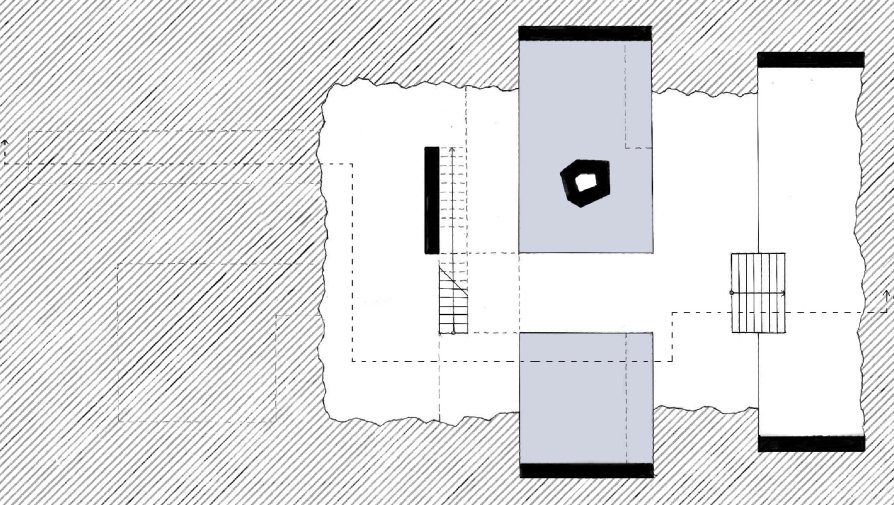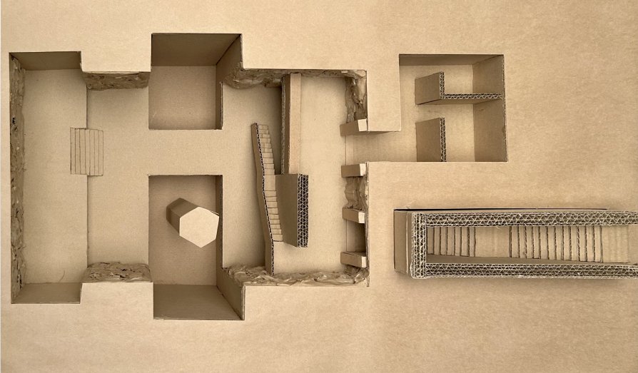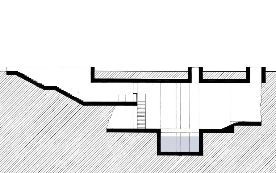 The building is located on the rocky Irish coast, a popular destination for climbers. It is hidden below ground level, with access provided by a long staircase leading underground. Upon entering the main space, visitors are met with a view of a wide range of climbing walls, varying in shape, texture, and difficulty. The use of raw, rough rock allows for climbing on natural surfaces. Different floor levels offer various wall heights, from low three-meter boulders to six-meter-high walls. A pool running across the width of the structure serves as a fall zone for several walls and a central pillar, which can also be climbed. Climbing the back wall gives visitors the option to exit the building through a skylight. The facility also includes amenities such as changing rooms, toilets and a bar.